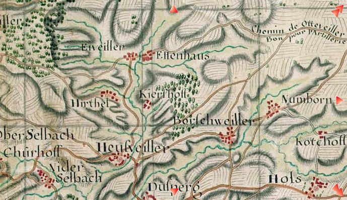 Naudin-Karte Nr. 3 von 1733 mit den 3 Ortsteilen Eiweiler (Eiveiller) Hellenhausen (Ellenhaus) Kirschhof (Kierhoff)