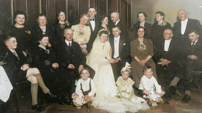 Hier ein Hochzeitsbild aus den 1950iger von Berthold Meyer's Hochzeit. Vorne 2. von links Lisa Meyer geb. Paul daneben Peter Meyer. In der mitte das Brautpaar Meyer.