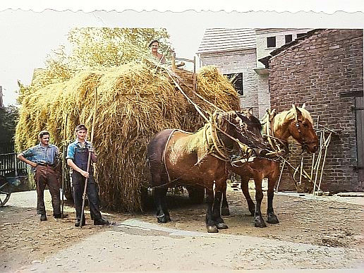 links Klaus Paul, in der Mitte ein Helfer, oben Peter Paul, die Pferde Rosa und Max (© Johannes Paul)