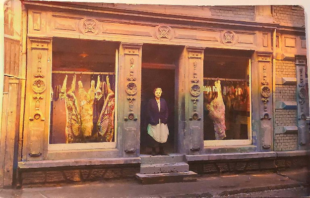 Die Metzgerei von Alois Paul in Völklingen-Werden. In der Tür Anna geb. Meyer, Frau von Alois Paul