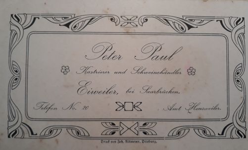 Visitenkarte von Großvater Peter, um 1900, Telefonnummer 20 Amt Heusweiler. Peter Paul, Maria geb. riehm und Peter Paul 1921