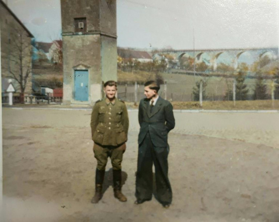 Hier ein Bild von 1944 vor unserm Haus. Peter (links) auf Heimaturlaub. Im Hintergrund noch das alte intakte Viadukt. Vorne das alte Transformatorhaus .(© Johannes Paul)